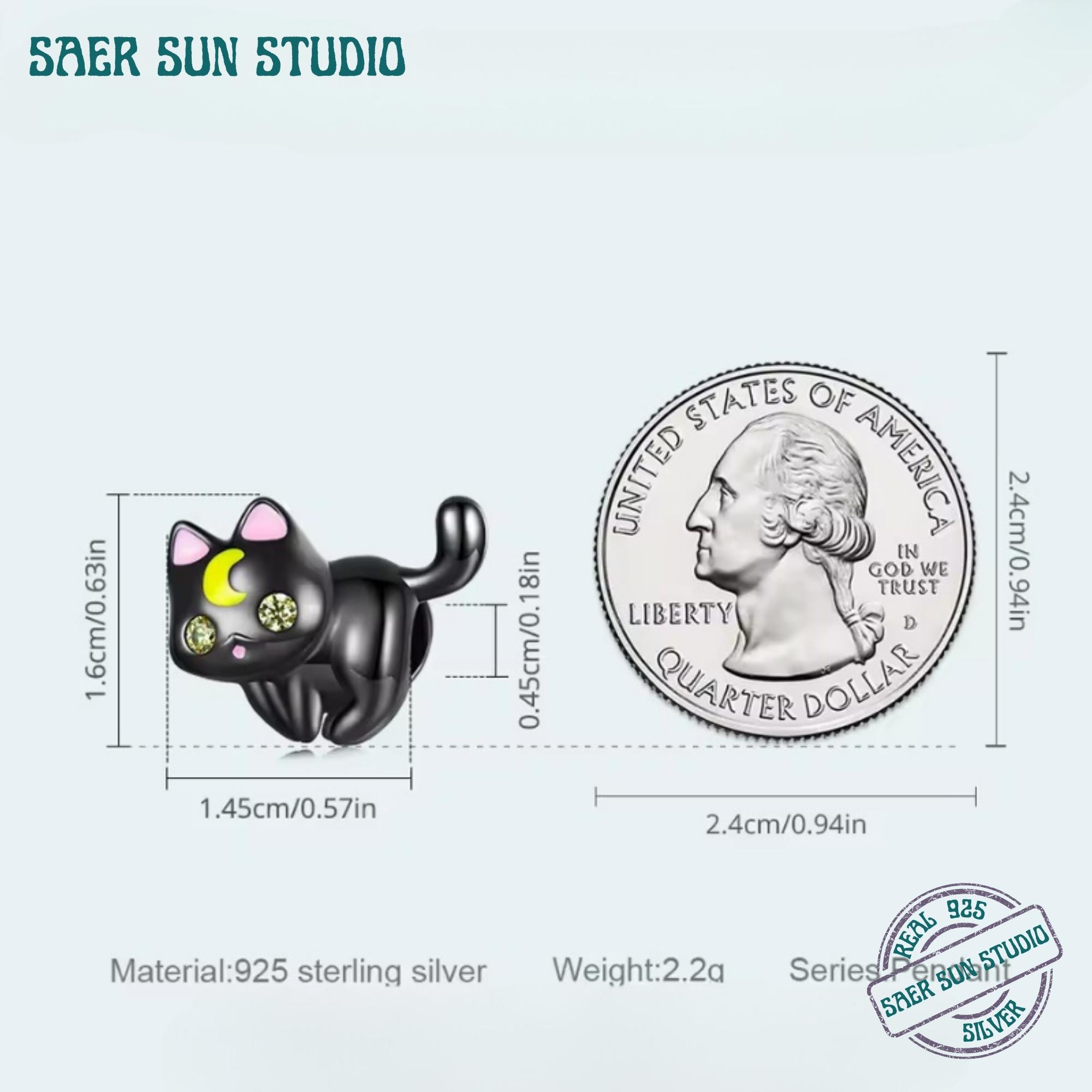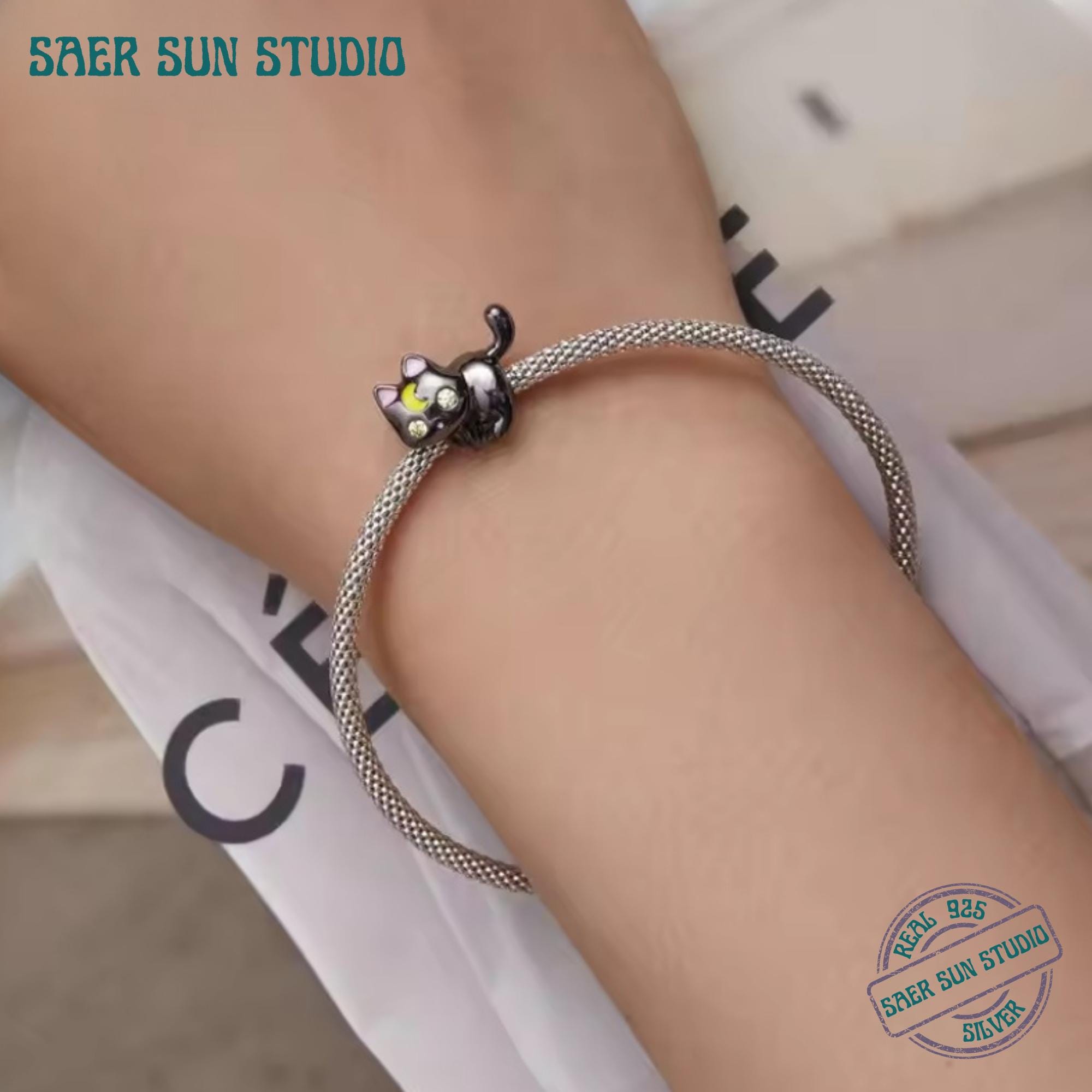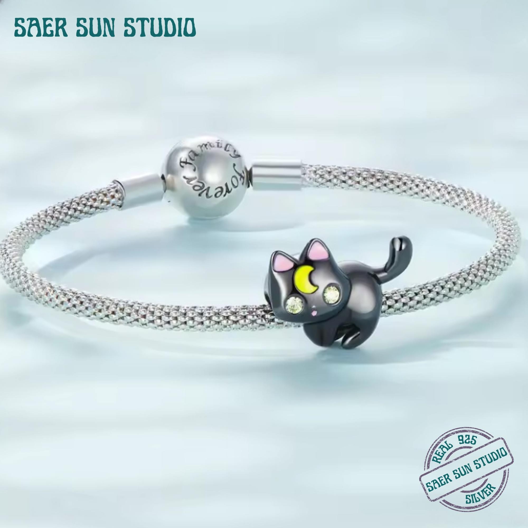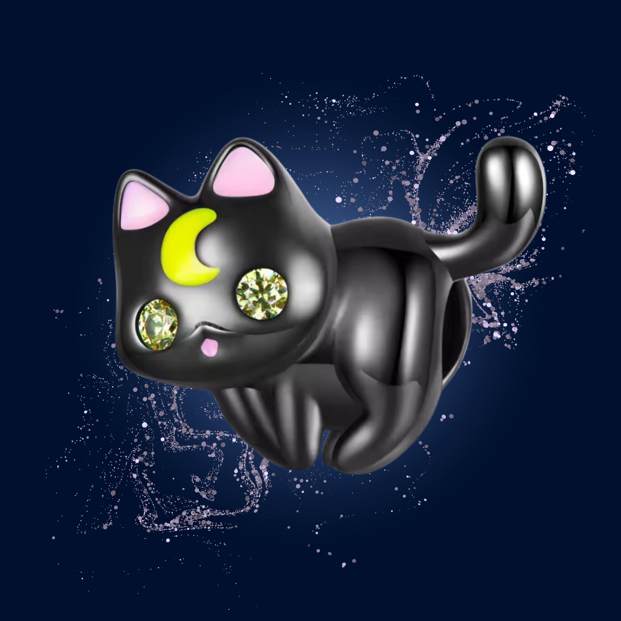 This 925 Sterling Silver Moon & Cat Charm Bracelet features a sleek black cat adorned with a crescent moon, representing protection, intuition, and feminine energy. Designed to fit DIY charm bangles and bracelets, this piece blends celestial symbolism with a cute, modern aesthetic.